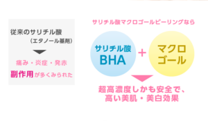 サリチル酸(角質溶解)をマクロゴール(酸が肌内部に浸透するのを予防する成分)という基材に溶かし、安全性を高めたものがサリチル酸マクロゴールピーリングです。