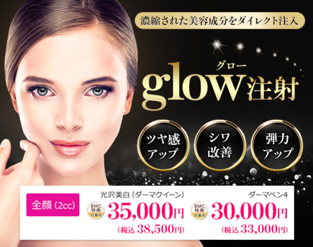 ※1,表示料金はglow注射,全顔/2cc(ダーマペン4)1回の料金,光沢美白ダーマクイーン全顔/2cc,1回毎38,500円(税込)