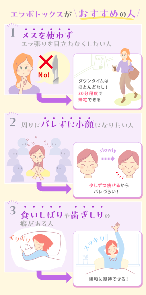 - エラボトックスは、メスを使わずエラ張りを目立たなくしたい人、周りにバレずに小顔になりたい人、食いしばりや歯ぎしりの癖がある人におすすめ