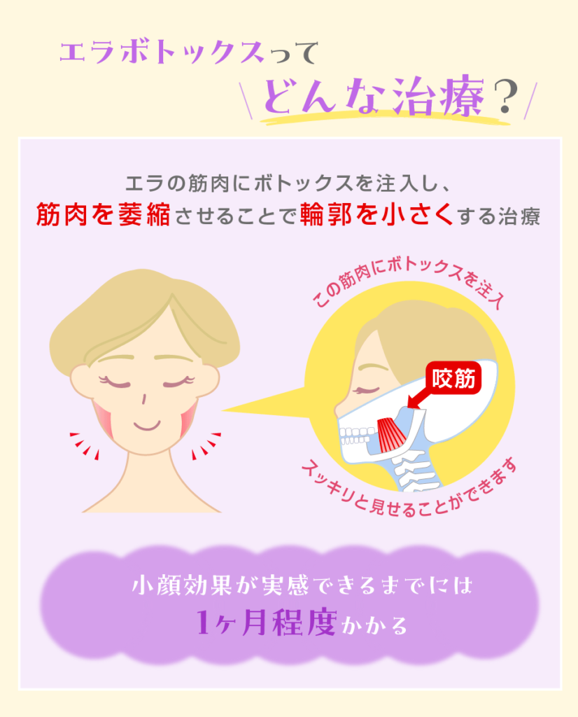 - エラボトックスは、ボトックスをエラの筋肉に注射することで、筋肉の動きが抑制されて弱まることで小顔効果が得られる治療