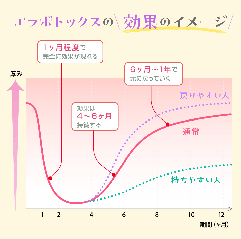 エラボトックスを打ってから、効果が表れてから切れるまでのイメージは以下の通りです。