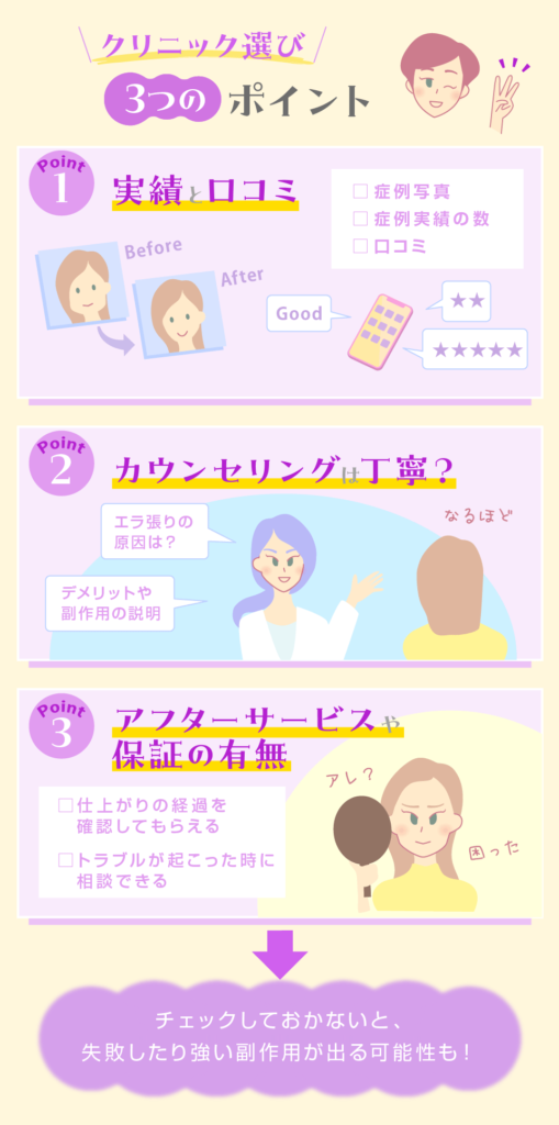 この記事では、エラボトックスの効果やクリニック選びのポイントについて解説してきました。