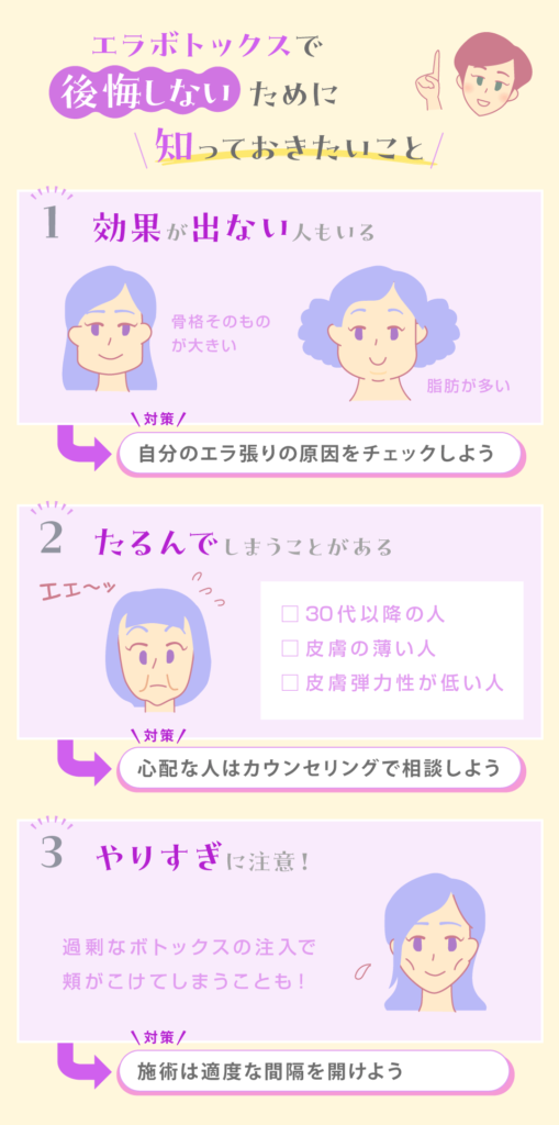 エラボトックスは、食べ物を噛むときに使うエラの筋肉を小さくする施術なので、物を噛むときに違和感が出る人もいます。
