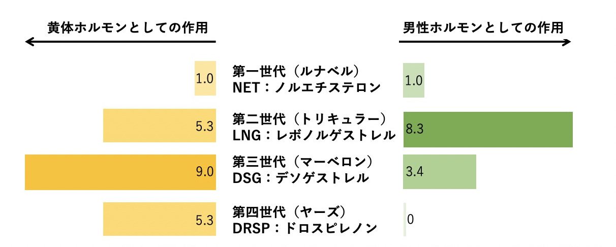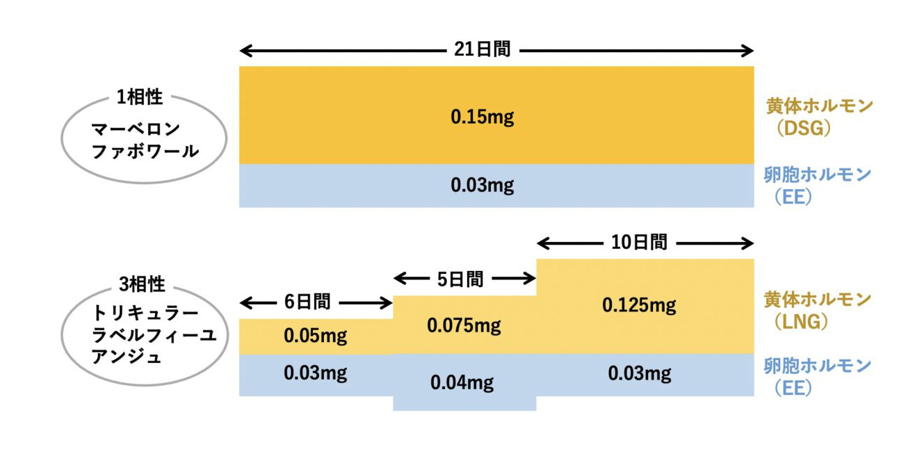 マーベロンに含まれる黄体ホルモンは、デソゲストレル(DSG)です。また低用量ピルは、黄体ホルモンの配合割合で1相性と3相性にわかれます。1相性は含まれる黄体ホルモンが一定で、3相性は黄体ホルモンの量が3段階に変化するのが特徴。