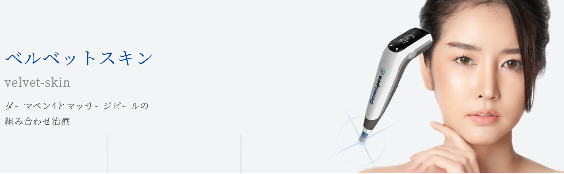ヴェルベットスキンは、ダーマペンとコラーゲンビールを組み合わせた施術です。ダーマペンで皮膚に穴を開けた肌にコラーゲン生成の効果が期待できるピーリング剤でマッサージしていくことで、肌トラブルの改善に導いてくれます。