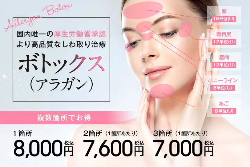アラガン製の小顔ボトックス注射です。安心保証制度もついており、安心して施術が受けられます。