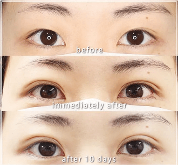 腫れている間はふたえの幅が広く見えます。はれがひいていくと少しずつ幅がおちついてきて、完全にはれが引くと手術のときに決めた幅になります。。
