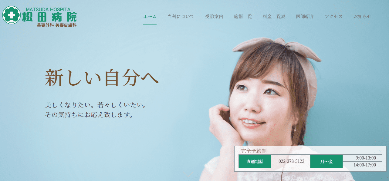 | 診療時間 | 美容皮膚科 月~金 9:00~12:30/14:00~18:00 (水 午後休診、木 午後は手術のため完全予約制) |