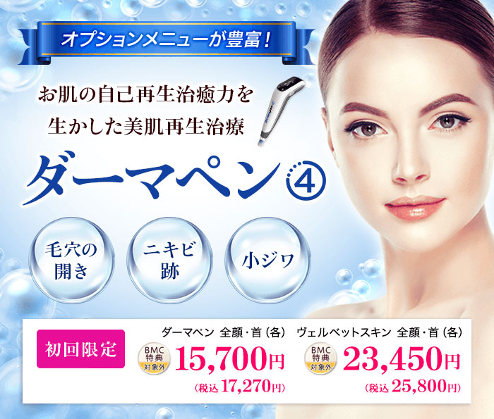 品川美容外科のダーマペンには、肌悩みに合わせてカスタムできるよう豊富なオプションが取り揃えられています。美肌ホワイト美容成分やヴェルベットスキン、ボツリヌストキシンなどが豊富なメニューがあります。