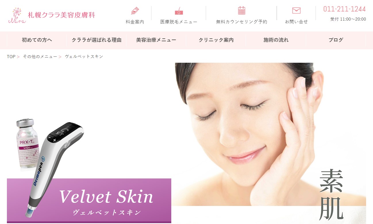 札幌クララ美容皮膚科ではヴェルベットスキンのキャンペーンを行っており、通常価格32,780円(税込)のところ、キャンペーン中は21,780円(税込)で施術を受けられます。期間中は何度でも同じ値段で受けられるので、お得に継続したい方に適しています。