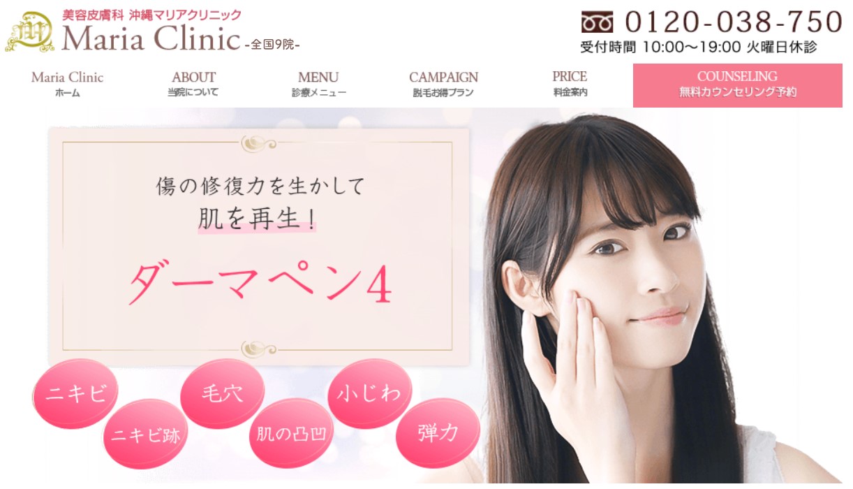 沖縄マリアクリニックのダーマペンは、全顔1回が19,800円(税込)です。複数回コースには3回・6回・9回と用意されており初めての方でも通い安いクリニックになっています。