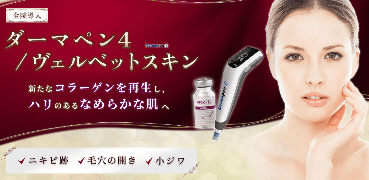 湘南美容クリニック横浜院では、ダーマペン4の薬剤塗布オプションが豊富。ビタミンC、トラネキサム酸、ボトックス(アラガン)、グロースファクター、ベビースキンが受けられます。さらに、ヴェルヴェットスキン、自己血サイトカインリッチを使ったACRSダーマペンの施術も扱っており、人気です。