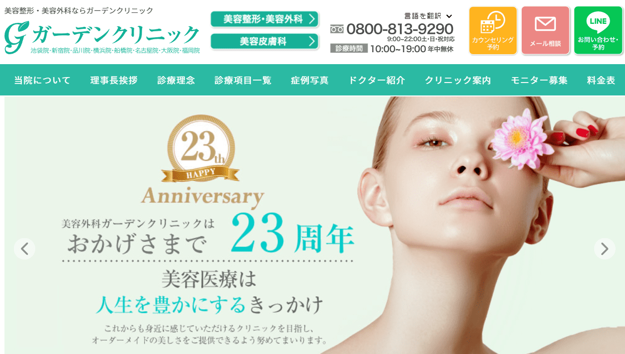 ガーデンクリニックは、開院23年と歴史ある美容クリニック。長年、診療を続けているということは、技術と信頼があるということ。じっくりとカウンセリングで相談に乗ってくれる人気のクリニックです。
