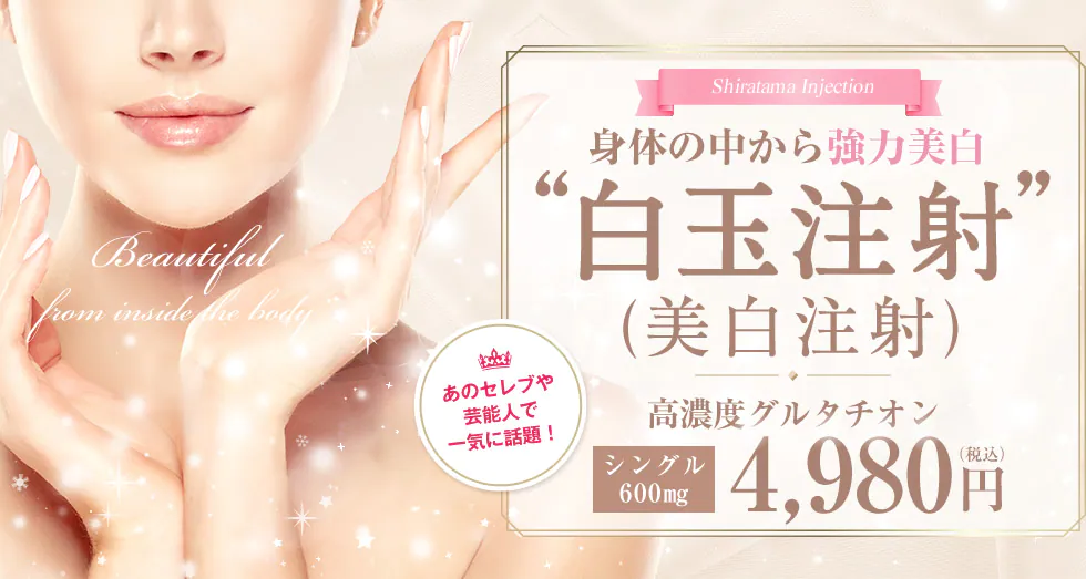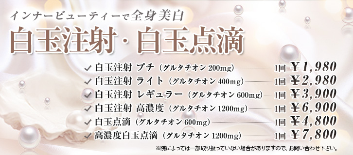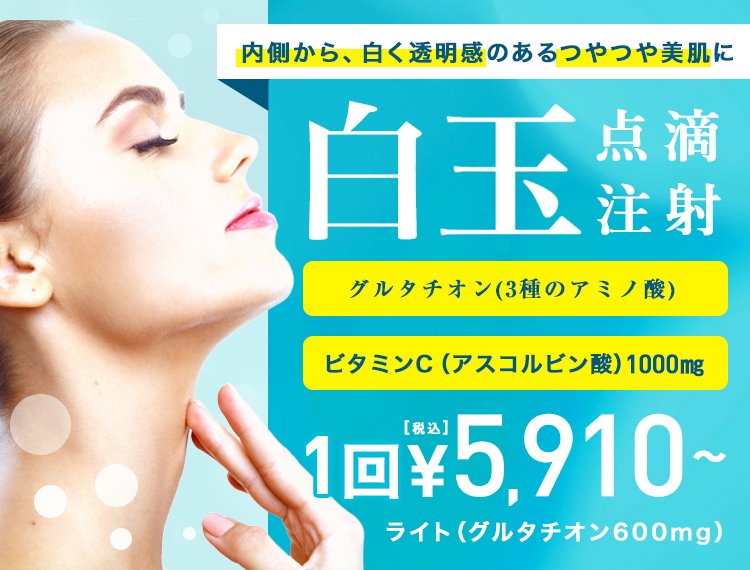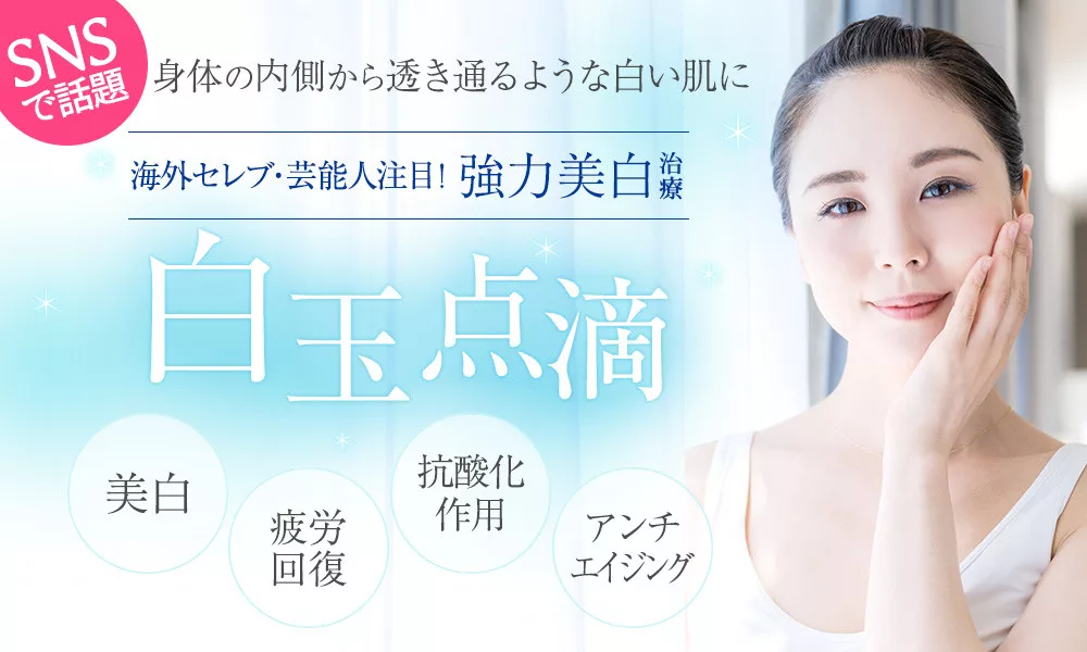 白玉点滴(グルタチオン点滴)は、抗酸化力の高い最強の美白点滴と呼ばれています。透明感のある明るいお肌になりたい方、アンチエイジング・美白におすすめの美白点滴です。
