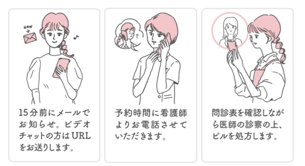 時間になると看護師より電話が入り、その後医師がWEB問診表を確認しながら診察を行い、ピルが処方されます。