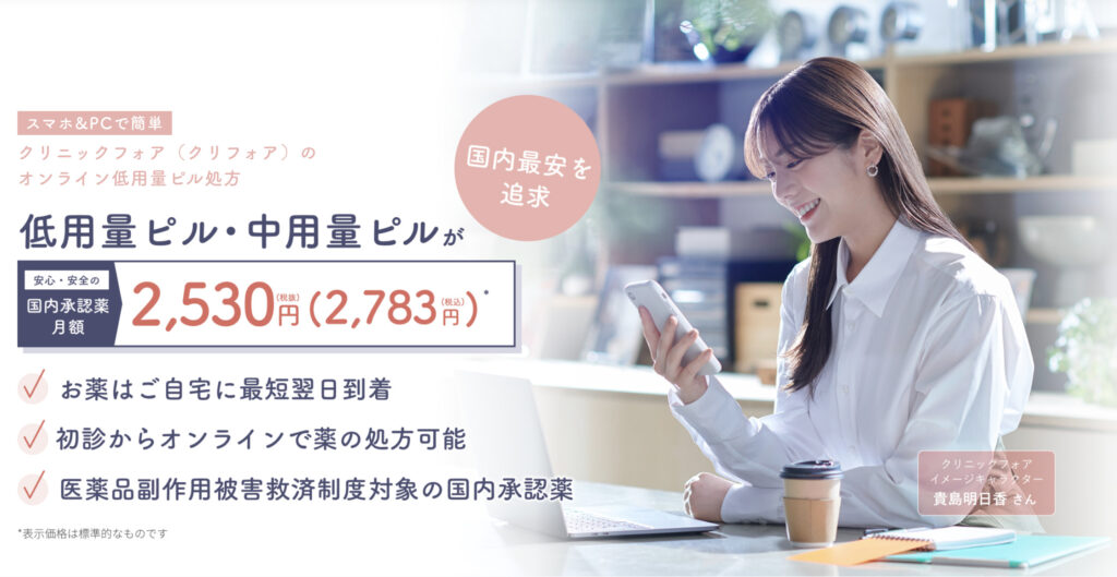 クリニックフォアはオンライン診療でも幅広い診療項目があり、ピルの処方に関しては低用量ピルの処方が日本で一番多いと言われています。