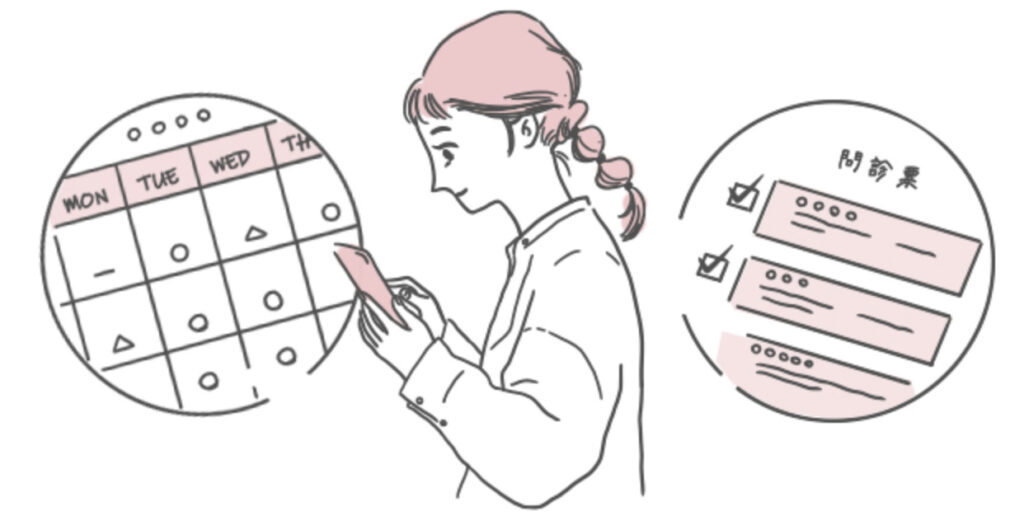 クリニックフォアのオンライン診療ホームページへアクセスし、予約画面でカレンダーから診察希望日を選択します。希望日時を入力したらWEB問診票に記入します。