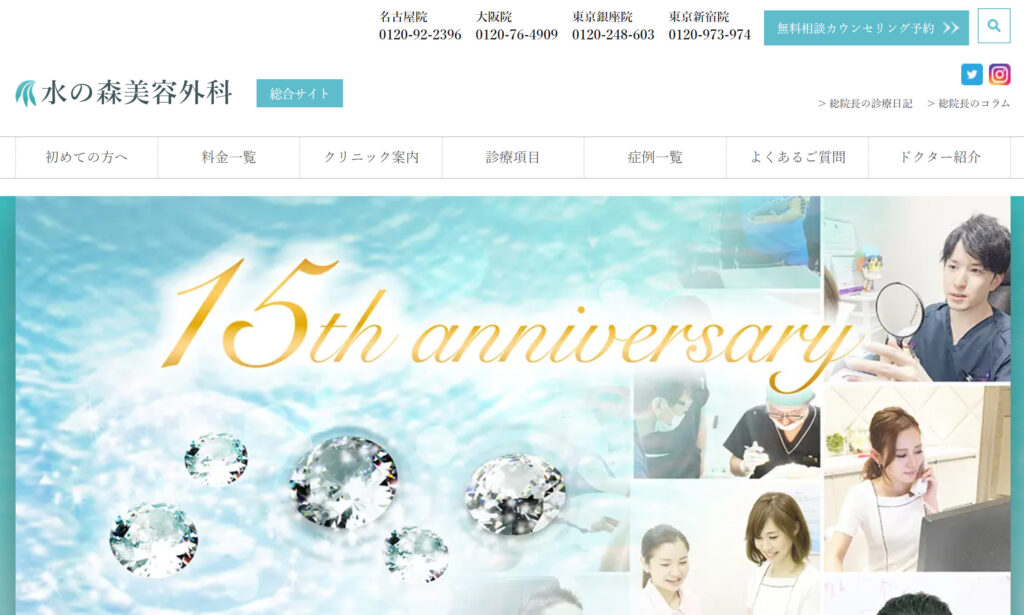 水の森美容外科は開院15年以上の実績を持つ美容クリニックで、カウンセリングやアフターケア(検診・処置代)はすべて無料となっています。