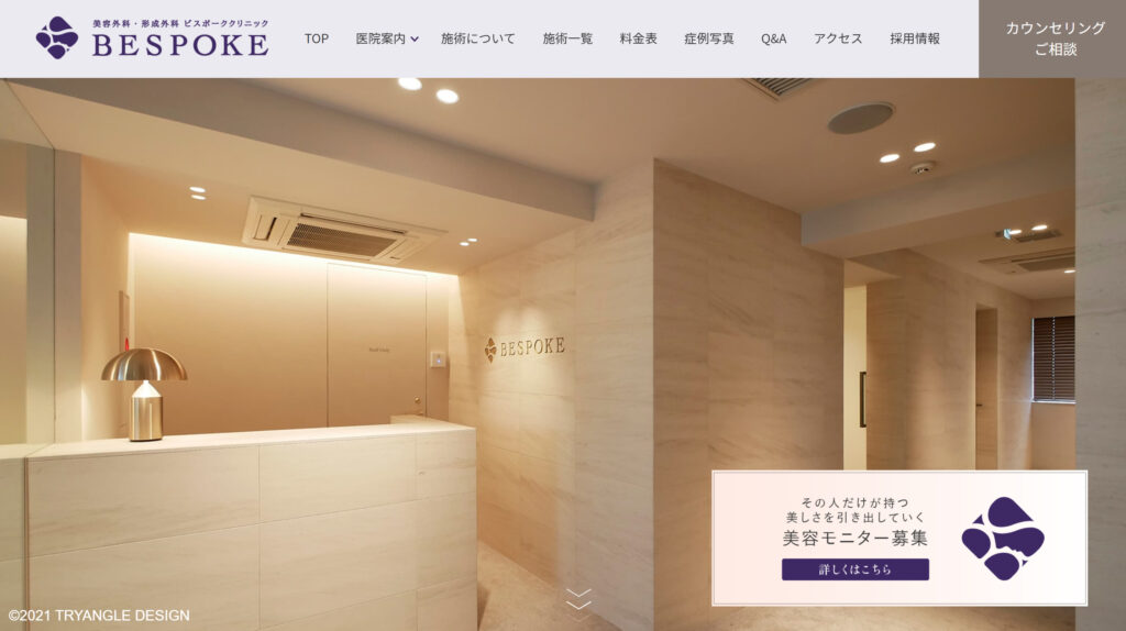 ビスポーククリニックは丁寧なカウンセリングを重視している美容外科・形成外科で、涙袋形成にはヒアルロン酸の他に筋膜移植やプロテーゼ挿入といったメニューもあります。